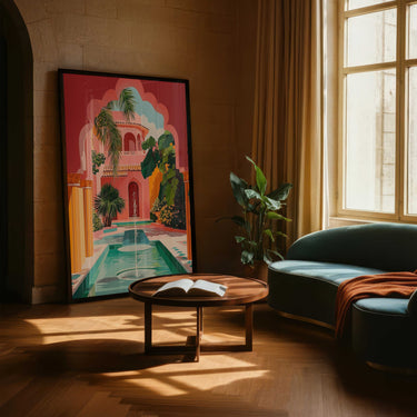 This vibrant pop art print features a stunning pink Moroccan palace, with a glorious aqua-colored fountain at its center. The bold, eye-catching colors and luxurious design evoke a sense of escape, exotic beauty, and high-end travel, making it an ideal addition for those seeking a touch of opulence and modern flair in their decor.