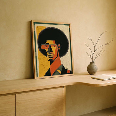 Bold and expressive, this cubist portrait is defined by its striking afro and graphic shapes. Angular forms and warm tones give the figure presence, while the gaze feels open rather than fixed or controlled. It’s modern and characterful, with a sense of curiosity and individuality rather than authority.