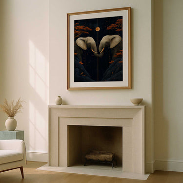 Two majestic elephants stand face to face beneath a radiant orange moon, their silhouettes framed by a deep, atmospheric backdrop. The contrast between the dark landscape and warm, glowing tones gives this art print a sense of quiet grandeur. With falling leaves drifting gently through the air, this artwork captures a perfect balance of stillness and movement, power and tranquility.