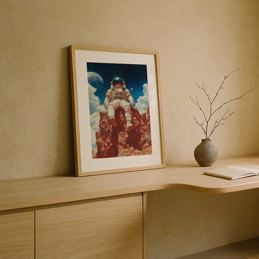 Under a vast, otherworldly sky, an astronaut stands atop a vivid red rock, taking in a surreal landscape of rolling deserts, drifting clouds, and distant planets. The fusion of cosmic wonder and earthly stillness creates a scene that feels both adventurous and introspective, drawing the viewer into an endless horizon of possibility.