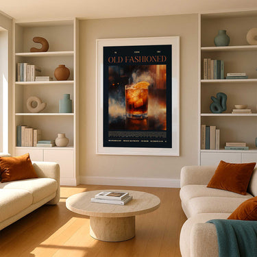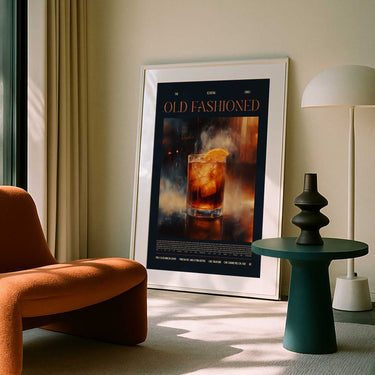 This arresting illustration features a smoky old fashioned cocktail, complete with a fun and tongue-in-cheek recipe. The bold design and playful details bring a modern twist to a classic drink, making it a perfect addition for those who appreciate unique, whimsical art with a nod to mixology. Ideal for adding character and charm to any bar or kitchen space.