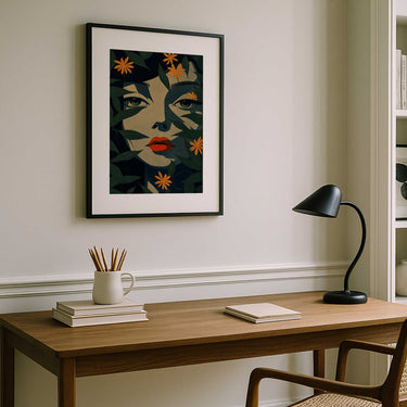 This print embodies understated elegance, featuring a serene face emerging from lush foliage, accented by vibrant orange blooms. The harmonious blend of soft contours and natural elements creates a tranquil, nature-inspired aesthetic that brings warmth and depth to any setting.