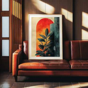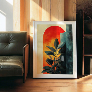 This abstract art features a green leaf set against a brilliant orange gradient background, reminiscent of a vibrant sun setting. The painting’s bold contrast between the natural greenery and warm, radiant hues creates a striking visual effect, evoking a sense of energy and harmony. Ideal for those who appreciate nature-inspired art with a contemporary twist, this piece adds warmth and life to any space.