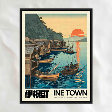 Rooted in the calm simplicity of Ine Town: a place where homes touch the water and mornings unfold in slow motion. Wooden boathouses line the shore in quiet rows, their reflections stretching across the bay until you can’t tell where the structure ends and the sea begins. Muted tones, still water, and straight lines turn the whole scene into a study of balance.