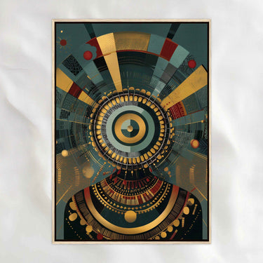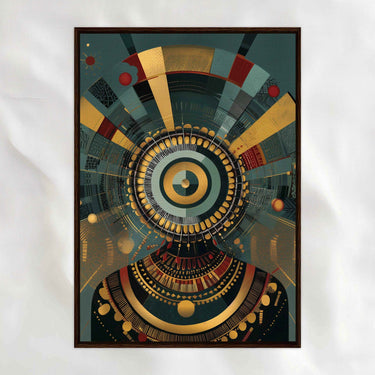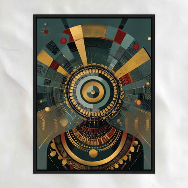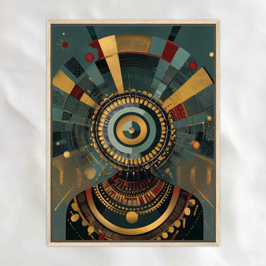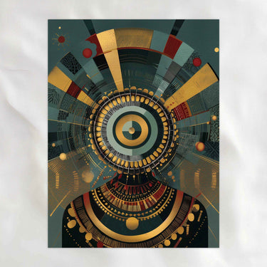 African-inspired with a futuristic edge, this piece feels expansive and ceremonial. Layered circular forms radiate outward, creating a sense of energy and focus, while the deep greens and warm golds add richness and depth. The composition feels powerful but controlled, bringing a sense of intention, movement, and quiet authority to your space.